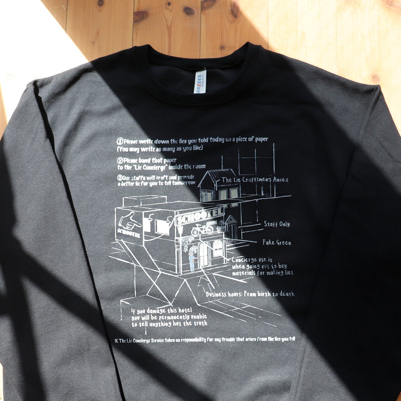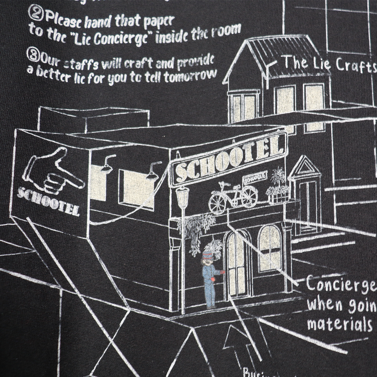 プライベートホテルSCHOOTELの案内図がプリントされたスウェットシャツ。